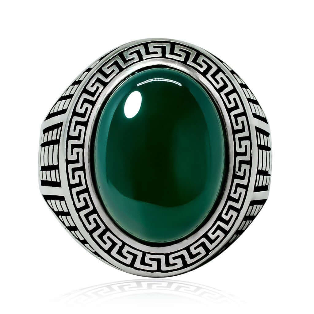 Sterling Silver Mens Greek Key Ring with Green Agate